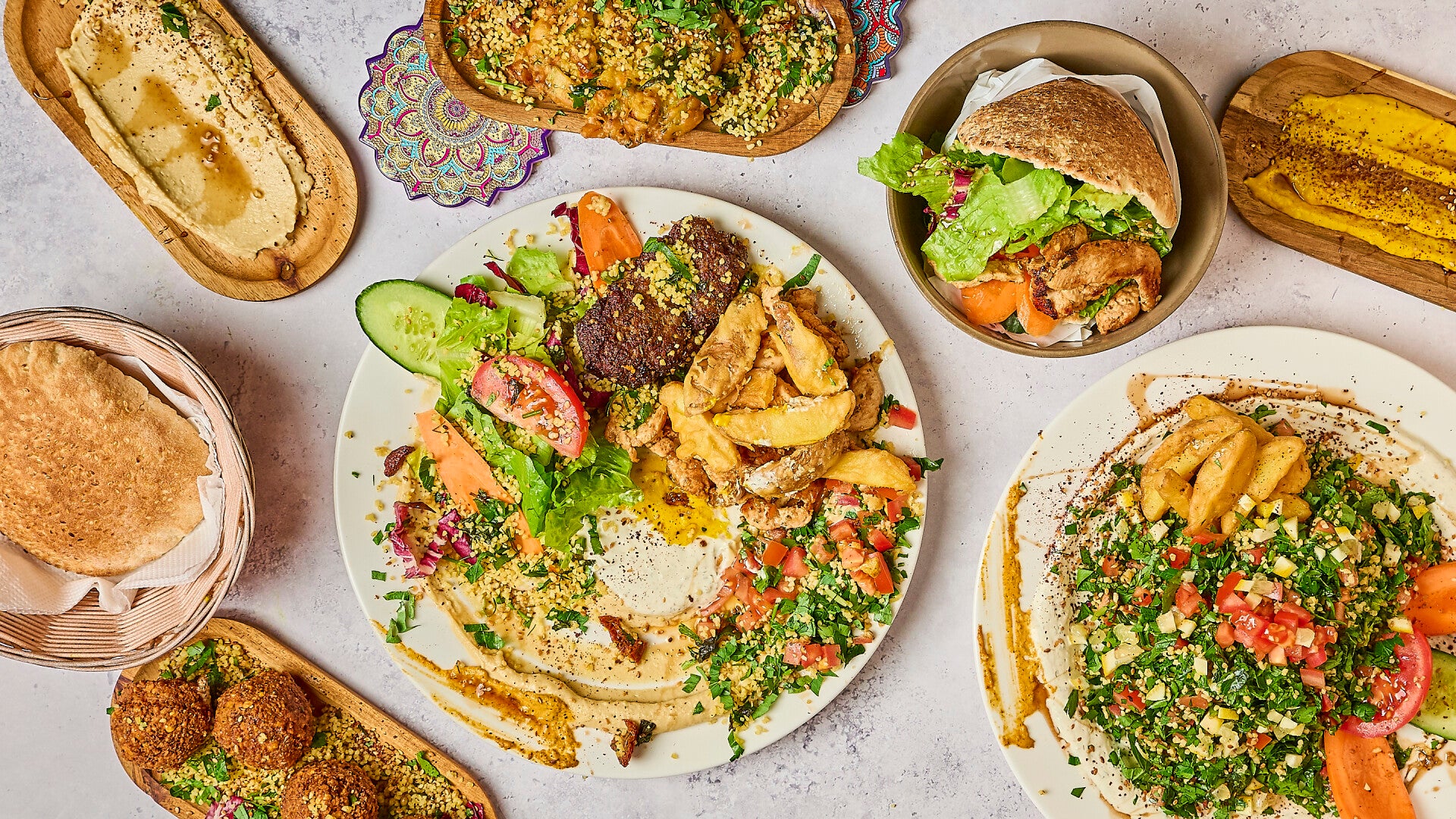Eine großzügige Portion Falafel mit verschiedenen Beilagen wie Hummus, Baba Ghanoush und Taboulé. Perfekt zum Teilen.